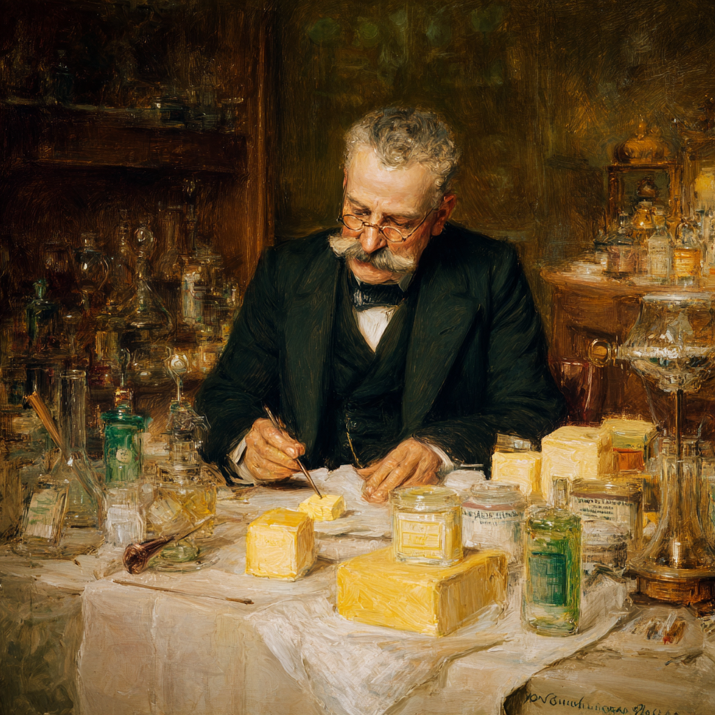 В 1869 году французский император Наполеон III объявил конкурс. Приз — 100 тысяч франков тому, кто придумает дешёвую замену сливочному маслу для армии и бедноты. Победил химик Ипполит Меж-Мурье. Он взял говяжий жир, смешал с обезжиренным молоком, добавил вытяжку из коровьего вымени для вкуса и получил первый в мире маргарин. Солдаты морщились, но ели. Бедняки были рады — наконец-то доступный жир для хлеба.