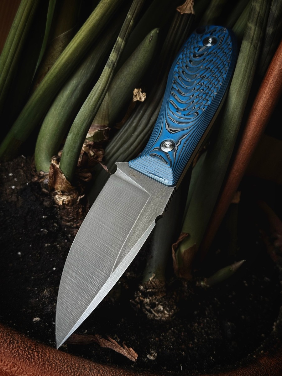 На эргономичной и ухватистой рукояти накладки из дизайнерского карбона в синих оттенках.
