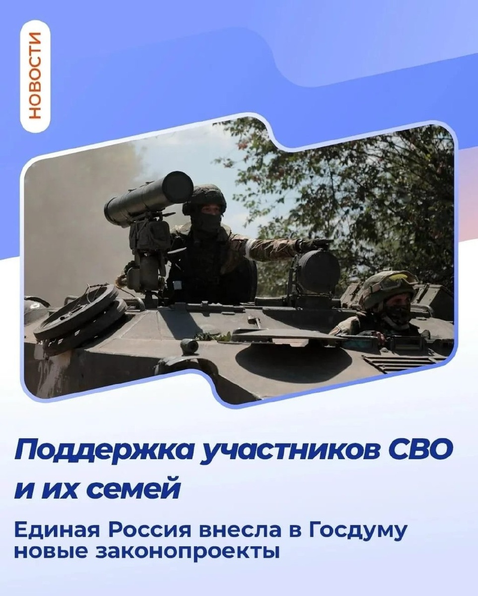 ✅ «Единая Россия» внесла в Госдуму законопроекты о дополнительных гарантиях прав военнослужащих и их семей. 🔹 Первый законопроект позволяет военнослужащим бесплатно проехать к месту прохождения ВВЭ (военно-врачебной экспертизы) на всех видах транспорта. 🔹 Вторая инициатива партии даст возможность вдовам и вдовцам участников СВО бесплатно и без вступительных экзаменов поступать на обучение в вузы и ссузы. 🔹 Третий законопроект позволит детям военнослужащих, сотрудников правоохранительных органов и добровольцев не терять меры поддержки в период после окончания школы и до поступления в вузы и колледжи. #ЕдинаяРоссия #ЕР68 #СвоихНеБросаем #ZаМир #депутатАвгустюков