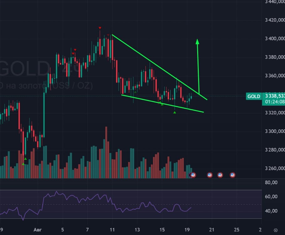 🥇 #Золото #GOLD #GD1 #bogdanoffinvest 🟢 Золото похожая ситуация, как в палладии. Тут не было никаких серьезных падений, но цена снизилась после прошлого импульсного роста, и расторговалась в клин. Предполагаю, что выход будет вверх. 🚗 Жду золото на 3400. Сигналы на покупку тут так же присутствуют.