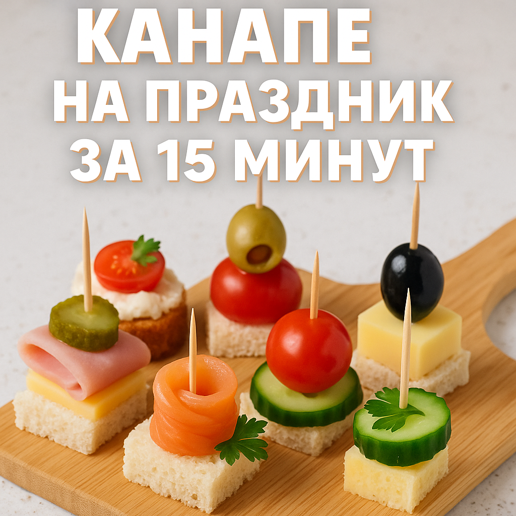 Вступление Канапе — это маленькие «шедевры» на вашей вечеринке. Они эффектно смотрятся, вкусны и готовятся практически мгновенно. Сегодня поделюсь рецептом трёх простых и стильных вариантов, которые займут не больше 15 минут вашего времени. Подойдёт как для семейного торжества, так и для внезапного гостевого вечера. Ингредиенты (на 20–24 канапе) 1. Основы: ⦁ Батон (или чиабатта) – 1/2 шт. ⦁ Ломтики чёрного хлеба – 6–8 шт. ⦁ Зубочистки – 24 шт. 2. Канапе с семгой и сливочным сыром: ⦁ Копчёная или слабосолёная семга – 100 г ⦁ Сливочный сыр (тип «Филадельфия») – 100 г ⦁ Укроп – несколько веточек 3. Канапе с ветчиной и оливками: ⦁ Ветчина (или буженина) – 100 г ⦁ Оливки без косточек – 12 шт. ⦁ Сыр твёрдый (гранж) – 50 г 4. Канапе с огурцом и помидором черри: ⦁ Свежий огурец – 1 шт. ⦁ Помидоры черри – 6–8 шт. ⦁ Моцарелла (мини-шарики) – 12 шт. ⦁ Базилик или петрушка для декора 5. Дополнительно: ⦁ Оливковое масло – 1–2 ст. л. ⦁ Соль, чёрный перец – по вкусу Шаг 1. Подготовка о
