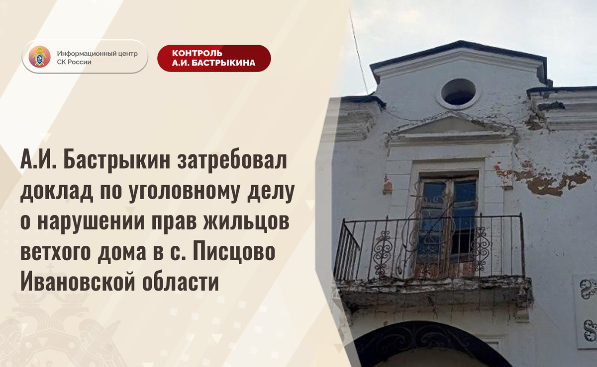 А.И. Бастрыкин затребовал доклад по уголовному делу о нарушении прав жильцов ветхого дома в с. Писцово Ивановской области В социальной сети сообщается о нарушении прав жильцов многоквартирного дома по улице Советской в селе Писцово Ивановской области. Конструкции здания, 1956 года постройки, разрушаются, системы централизованного водо-, газо- и теплоснабжения, водоотведения отсутствуют, подача электроэнергии в помещения длительное время не осуществляется, печное оборудование неисправно. В октябре 2022 года межведомственной комиссией выявлены основания для признания одной из квартир непригодной для проживания, однако до настоящего времени статус аварийной ей не присвоен, благоустроенное жилье гражданам не предоставлено. В СУ СК России по Ивановской области возбуждено уголовное дело. Председатель Следственного комитета Российской Федерации Александр Иванович Бастрыкин затребовал у руководителя СУ СК России по Ивановской области Дмитрия Аркадьевича Позовского доклад о предварительных и о