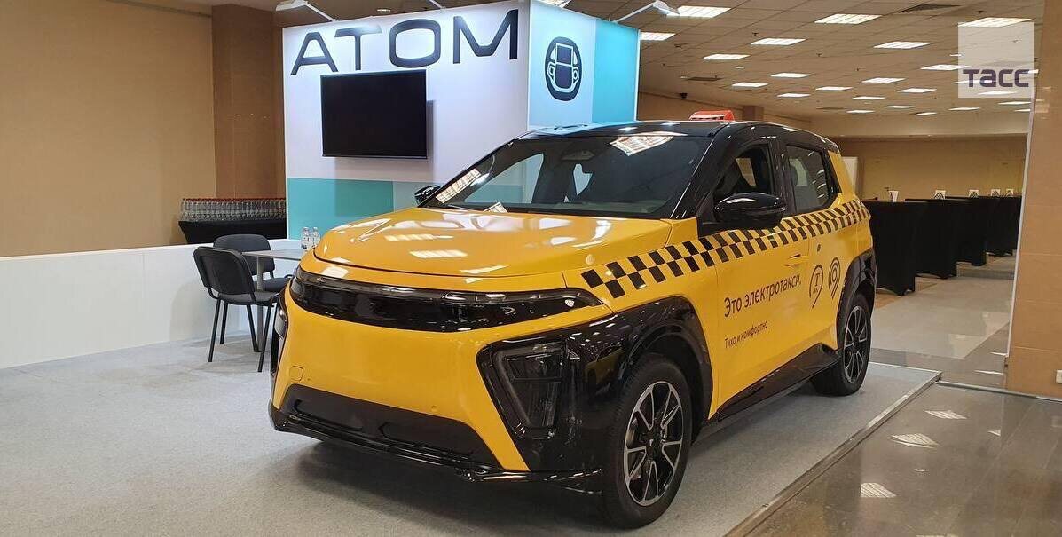 Российский электромобиль «Атом» в варианте «такси» представлен на МЕФТ-2025. От обычного Атома он отличается удешевленной комплектацией, легкомоющейся отделкой салона, желтой окраской кузова и мотором сниженной мощности. Запас хода на одном полном заряде — до 500 км. Запас энергии, достаточный для пробега в 100 км, восполняется за 8 минут.