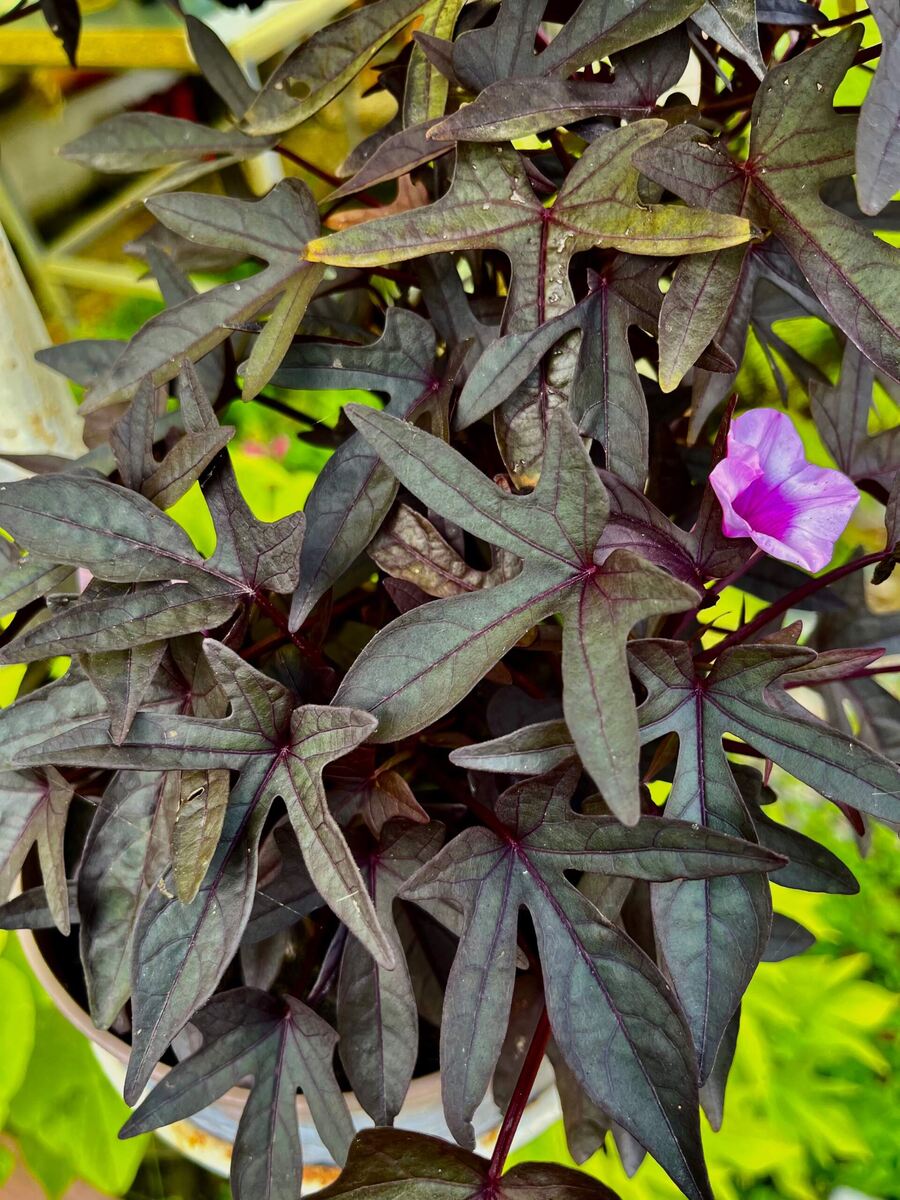 Кроме них, у меня еще пять выживших, тех, что показывала недавно в ролике. Но я их чуть не загубила, когда на них случайно попал репеллент от комаров. А потом они потихоньку начали обрастать. Эти шесть живут у меня уже несколько лет. Это единственная ипомейка что цвете и образует клубни. Я её называю "бабочка". Это красотка мраморная. В этом году ведет себя прилично и очень даже хорошо наросла. Салатовый с резным листом Эту я называю рыжей. Лист подвыгорел на солнце, но если подольше постоит погодка без заморозков, то в таких благоприятных условиях она еще покажет свою красоту. Внутри листики красивущие. Это салатовая, но лист не резной. Еще один зеленый ампельный не сфоткала, он на фото ниже, внизу справа. А вот так я обрезала все черенки, оставив по минимуму листьев на каждом. У одного черенка перепутала «верх» и «низ» и оставила два отростка на одном черенке. Корни даст по всему стволику, и кустик будет пышнее. Подтвердилось мое наблюдение, что корни у бататов появляются в тепле п
