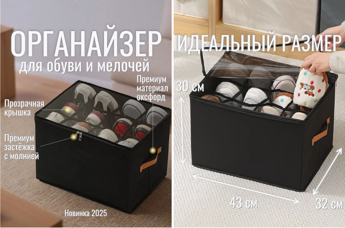 Разбросанная обувь — это проблема, которая знакома многим. И, по-моему, один из лучших способов решить её — это использовать специальные органайзеры. Этот вместительный короб на 12 ячеек помогает не просто спрятать обувь, но и защитить её от пыли.