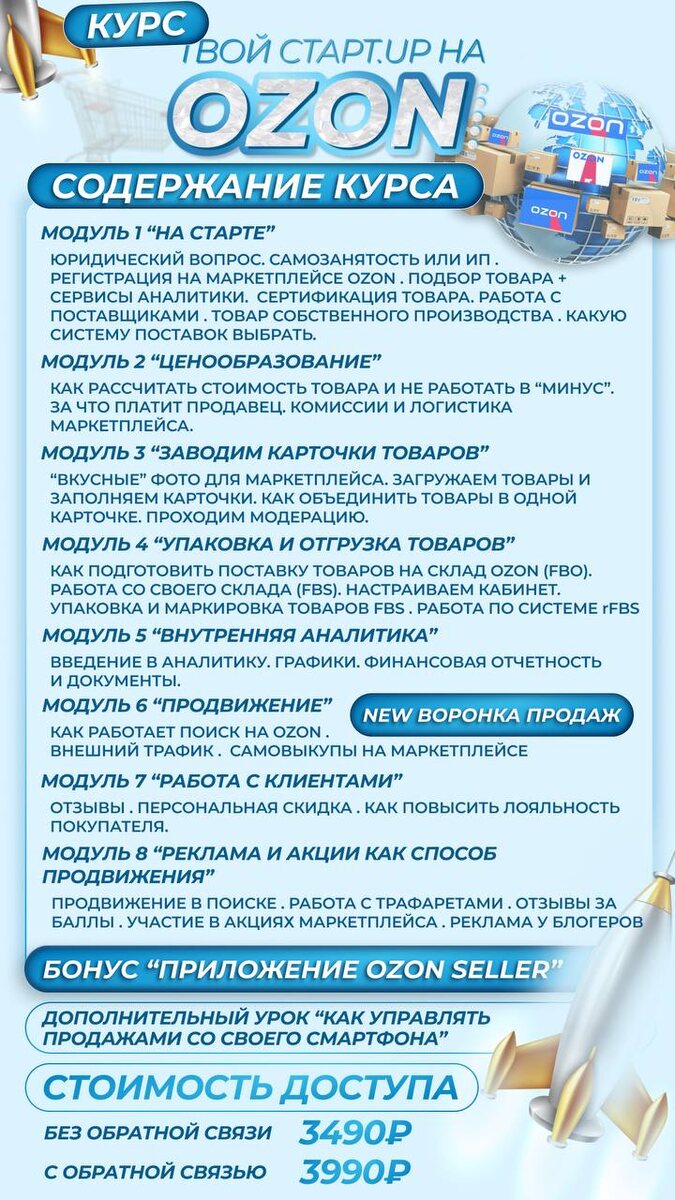 Всем доброе утро! Сегодня я Вам дам последнюю порцию информации о бизнесе с Озон И так изучайте: Урок 21 Воронка продаж NEW Урок 22 Внешний трафик Урок 23 Самовыкупы на маркетплейсе Урок 24 Отзывы Урок 25 Персональная скидка Урок 26 Как повысить лояльность покупателей Урок 27 Продвижение в поиске Урок 28 Работа с трафаретами Урок 29 Отзывы за баллы Урок 30 Акции Урок 31 Реклама у блогеров Бонус. Приложение OzonSeller Как получить сертификат Теперь у Вас уже есть полное представление о бизнесе с OZON И я уверена, что многие из моих подписчиков захотят попробовать свои силы в этом бизнесе. Рискнёте попробовать свои силы в этом бизнесе? Свои ответы пишите в комментариях. #БизнесcOzon #тарифы #тарифТрафик #Преимуществапроекта #НовыеВозможности #Инфографика #Обновления #Развитие #БизнесРост #доход #Трендовыепрофессии2025 #успех #Телеграм #MillionGo #ОксанаPROЗаработоксMILLIONGO #MillionGo #деньги #ЗаработокОнлайн #РаботаИзДома #ДополнительныйДоход #ОбучениеИБизнес