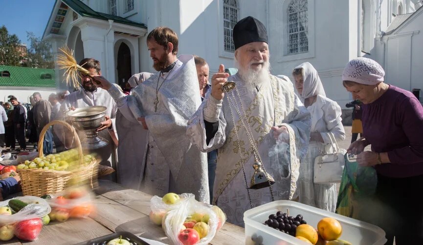 Вообще по древней традиции в этот день положено было освящать виноград, из которого делалось вино для таинства святого причащения. Но на Руси, где по большей части виноград не вызревает, его заменили яблоками. Целые горы яблок лежат в этот день на длинных, наскоро сбитых столах во дворах всех православных храмов. Священник читает над ними специальную молитву о плодах и винограде, щедро кропит святой водой и яблоки, и прихожан, которые их принесли. И каждый, кто пришел в этот день в церковь, получает по яблоку.