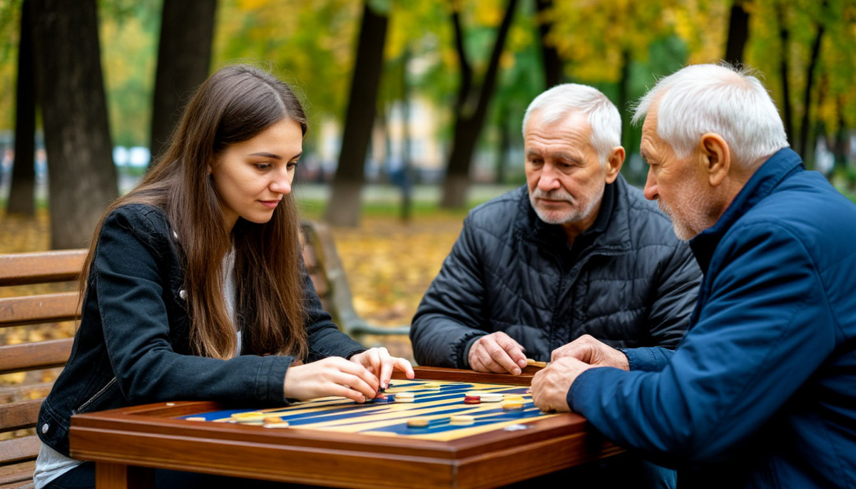 Осенний парк был наполнен тишиной и умиротворением. Листья медленно кружились в воздухе, создавая причудливый танец, а редкие прохожие спешили по своим делам, кутаясь в теплые шарфы. В самом центре парка, за деревянным столиком, склонившись над доской для нард, сидел пожилой мужчина. Его морщинистые руки уверенно передвигали фишки, а глаза внимательно следили за каждым ходом, будто он вел важную партию с невидимым соперником.