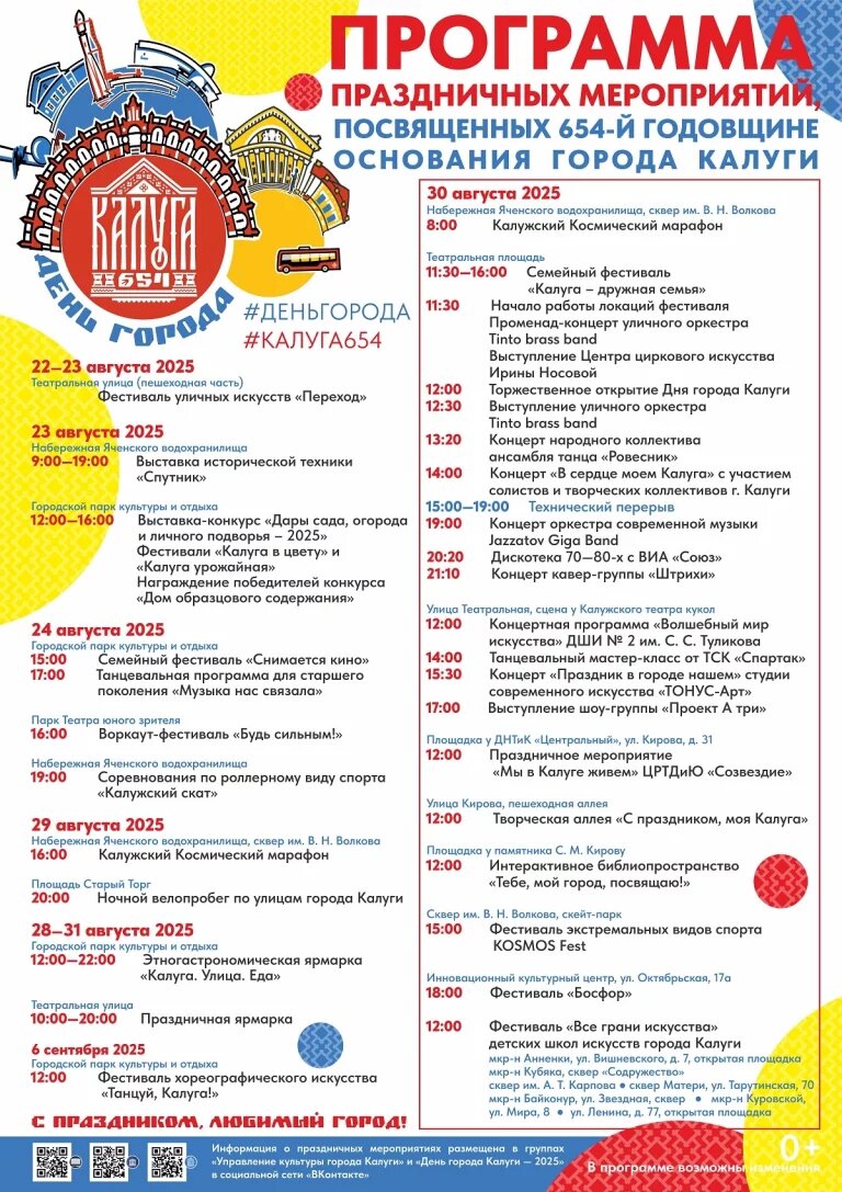 Торжества в честь 654-летия Калуги стартовали уже 22 августа фестивалем «Переход». Народные гуляния развернутся на всех главных площадках города. Основные события запланированы на 30 августа. Утром на набережной Яченского водохранилища пройдет Космический марафон. Главной сценой праздника станет Театральная площадь, где с 11:30 начнутся выступления местных творческих коллективов - танцевальных, вокальных, цирковых, оркестровых и многих других. Несмотря на отсутствие приглашенных звезд, зрителей ждет программа с участием калужских артистов. Основные торжества пройдут 30 августа. Набережная Яченского водохранилища, сквер им. В. Н. Волкова Театральная площадь, семейный фестиваль «Калуга - дружная семья» Улица Театральная, сцена у Калужского театра кукол Площадка у ДНТиК «Центральный», ул. Кирова, д. 31 Улица Кирова, пешеходная аллея Площадка у памятника Кирову Сквер им, В. Н. Волкова, скейт-парк Инновационный культурный центр, ул. Октябрьская, 17а Фестиваль «Все грани искусства», детских