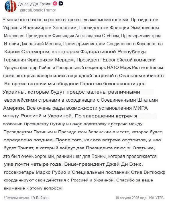 Путин и Зеленский встретятся вдвоем — Трамп. Это будет первая встреча президентов с начала СВО. Трамп уже начал договариваться о месте встречи. После этого пройдут трехсторонние переговоры, на которых будут Путин, Трамп и Зеленский. Я готов для встречи с Путиным — Зеленский Заря | Новости - Подписаться