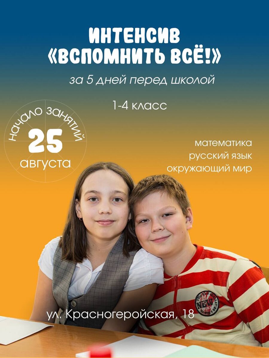 🌷 Напоминаем, что 25 августа , стартует 😄😌😋☺️😌😞😄😉 "Вспомнить все" для школьников 1️⃣➖4️⃣ классов по адресу: Красногеройская, 18. ➡️ Мы проверяем готовность запуска и создали чаты в Телеграме для удобного общения. Если вы еще не добавлены в чат, пожалуйста, позвоните по телефону 8 (950) 164-52-44. 🟣 Или оставьте заявку https://vk.com/smaylik_academy?from=groups&ref=group_menu&w=app5708398_-17376388 Спасибо! Ждем вас на нашем интенсиве!