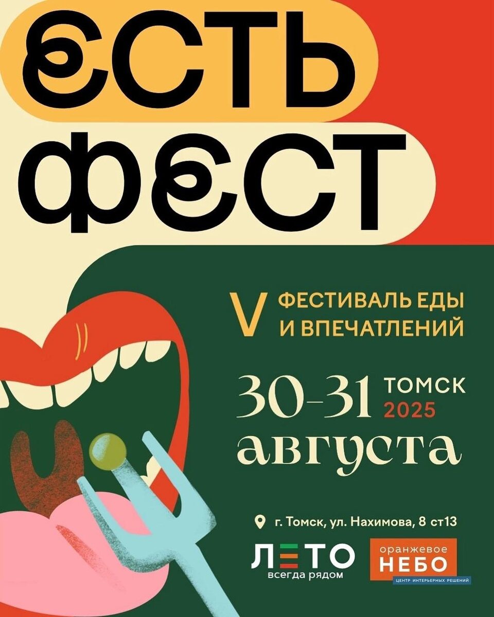 Август богат на фестивали 🎉 После «Праздника Топора» отправляемся на «Есть Фест», который пройдет 30 и 31 августа! На гастрофесте будут представлены 60 участников из Томска и соседних регионов, каждый из которых привезёт свою уникальную концепцию (видимо, чтобы попробовать всё, придётся совсем не есть, начиная с понедельника). Для тех, кто предпочитает домашнее магазинному, на празднике будет работать фермерский рынок 🐮 А если вы хотите научиться чему-то новому в кулинарном ремесле, то к вашим услугам будут мастер-классы от шефов и блогеров. Ещё можно будет посетить лекторий и специальный кофейный шатёр, а после такого вкусного и увлекательного путешествия отправиться за шоу-программой на главную сцену! 📍Площадь у ТРК «Лето» и ЦИР «Оранжевое небо» 🗓 30-31 августа с 10:00 до 22:00 Источник