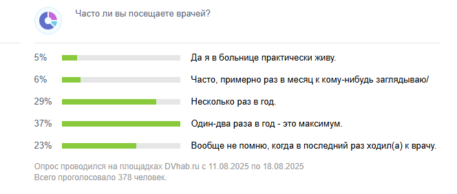 DVHAB.ru провел опрос читателей на тему здоровья, а именно: как часто они посещают врачей. Самым популярным ответом стал вариант «один - два раза в год» - 37% посчитали это своим максимумом. 29% отметили, что ходят к специалистам несколько раз в год, а чуть меньшее количество - 23% - не помнят, когда последний раз были на приеме у доктора. Абсолютное меньшинство оказалось тех, кто «практически живет в больнице» - 5%, и лишь 6% раз в месяц стабильно посещают врачей. Отметим, что на главной странице DVHAB.ru каждую неделю проводятся опросы на самые актуальные и острые темы. Найти вы их можете, пройдя по ссылке. Напомним, ранее мы узнавали, сколько хабаровчан уже пользуются новым мессенджером MAX. Опрос показал, что 58% жителей Хабаровска даже не слышали о нем. Лишь 7% установили его и иногда используют, а 10% признались, что у них нет подходящего смартфона для запуска приложения.