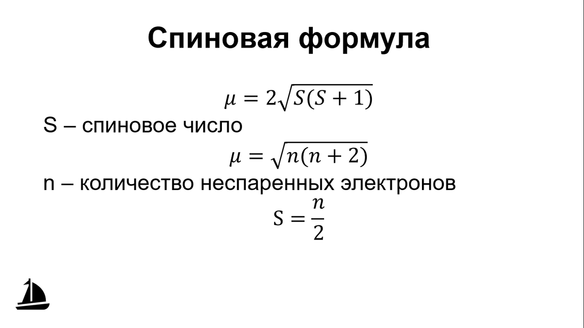 Магнитный момент зависит как от спинового числа (связанного с количеством неспаренных электронов), так и от орбитального. Однако в большинстве случаев влиянием орбитального углового момента можно пренебречь. Поэтому можно будет использовать спиновую формулу, которая является хоть и приближением, но достаточно полезным. Эффективный магнитный момент рассчитывается из молярной восприимчивости, которая определяется экспериментально с помощью весов Гуи или весов Фарадея. Таким образом, зная магнитный момент, можно определить количество неспаренных электронов. Примером практического применения этому - возможность определения геометрии комплексного иона состава d8. Задание Решение Для низко-спинового комплекса расщепление большое и электроны вначале заполняют орбитали с низкой энергией. Количество неспаренных электронов всего 2. Для высоко-спинового комплекса расщепление незначительное, поэтому для электронов более выгодное положение сначала выстроиться по одному. Количество неспаренных элек