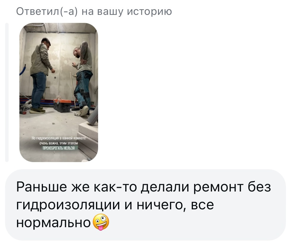 Ну да. Жили! Только тогда ванные были бетонные, стены — масляной краской намазаны, а пол — просто кафель на цемент. Никаких тёплых полов, гипсокартона, дизайнерской плитки и декоративных покрытий. ✔️ стяжка с подогревом ✔️ влагочувствительные материалы ✔️ керамогранит ✔️ швы с герметиком ✔️ короба из гипсокартона И всё это может выйти из строя, если дать влаге доступ к основанию. 📌 Плитка ≠ защита от воды Многие думают: «Ну я же плиткой всё закрою, нормально будет». НЕ БУДЕТ! Швы со временем трескаются➡️ Герметик усыхает➡️ Плитка может отойти➡️ А влага — она такая, пролезет везде… И вот она уже делает своё дело: разводит грибок под ванной, разрушает стяжку и бетон, потихоньку капает к соседям снизу. Грибок под ванной — это классика… Откровенно: почти у каждого, кто не делал нормальную гидроизоляцию, под ванной живёт грибок. Тёмные пятна, отваливающаяся штукатурка, запах сырости — узнаёте? Влажные стены и пол — идеальная среда для грибка. Гидроизоляция создаёт барьер, не пуская влаг