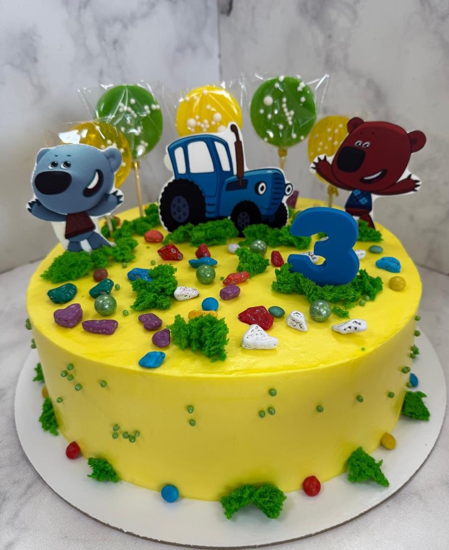 Этот торт заставил малыша прыгать от счастья – а ваш праздник готов к волшебству? 🎂✨ 😊 В "Карамель" мы обожаем делать мечты сладкими реальностью. Вот свежий пример: этот яркий тортик на 3 годика для маленького фаната "Ми-ми-мишек"! 🐻🚜 Желтый крем как солнечный день, зеленая "травка" из хрустящей крошки, забавные фигурки медвежат и трактора, плюс куча разноцветных конфеток – все по индивидуальному заказу мамы. Внутри – нежный бисквит с фруктовой прослойкой, чтобы было не только красиво, но и вкусно до последней крошки! 🍭 #ТортНаЗаказ #КарамельКондитерская #ДеньРожденияРебенка #МиМиМишки #СладкиеМечты #ИндивидуальныйДизайн #ТортыДляДетей #ПраздникВСтиле #СладостиНаЛюбойВкус