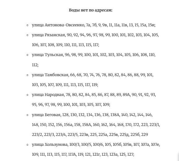 Жители Коминтерновского района Воронежа утром остались без водоснабжения. Без воды оказались около 350 домов. Причиной стала авария на водопроводной сети по адресу улица Хользунова, 115. На месте повреждения уже ведутся ремонтные работы. В настоящий момент сроки ликвидации аварии уточняются. В качестве временной меры жителям рекомендовано использовать техническую воду из ближайших источников. Набрать воду можно на следующих адресах: - Улица Хользунова, дома №113 и №125; - Улица Беговая, дома №225 и №223в.