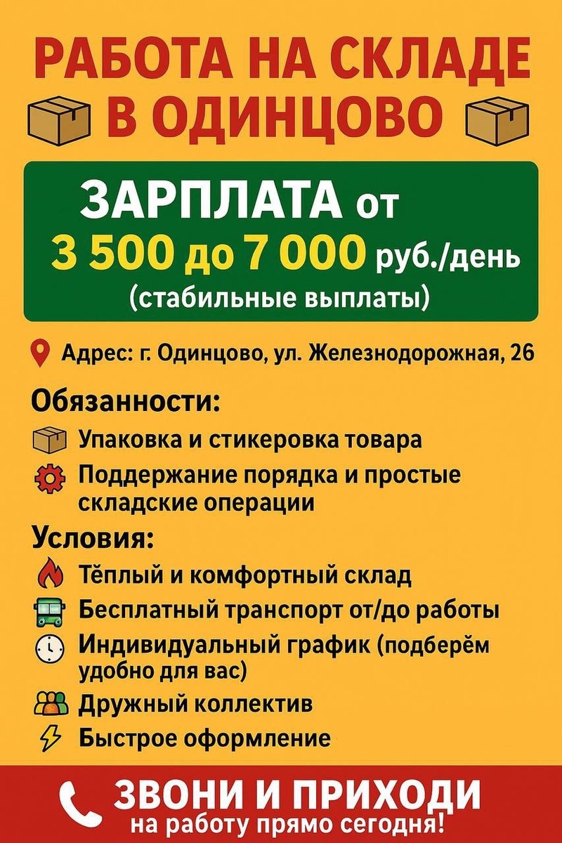 Работа на теплом складе в Одинцово 📦 Зарплата от 3 500 до 7 000 рублей/день (стабильные выплаты) 📍Одинцово, ул. Железнодорожная, 26 Склад — это современное, чистое и тёплое помещение. Здесь хранят и готовят к отправке БАДы и спортпит. Работа простая и не требует опыта — всему обучат на месте! Открытые вакансии: ▫️Работник склада ▫️Упаковщица ▫️Стикеровщица График работы: с 9:00 до 19:30 Обязанности: ▪️Упаковка и стикеровка БАДов и спортпита ▪️Подготовка заказов к отправке ▪️Поддержание порядка и простые складские операции Условия: ▫️Тёплый и комфортный склад ▫️Бесплатный транспорт от/до работы ▫️Индивидуальный график (подберут удобно для вас) ▫️Дружный коллектив, поддержка и обучение с первого дня ▫️Быстрое оформление — начни работать уже завтра! Звони и приходи на работу прямо сегодня: +7 (926) 747-96-90 | ИП Васильев Олег Геннадьевич | ИНН 344313950210 Источник