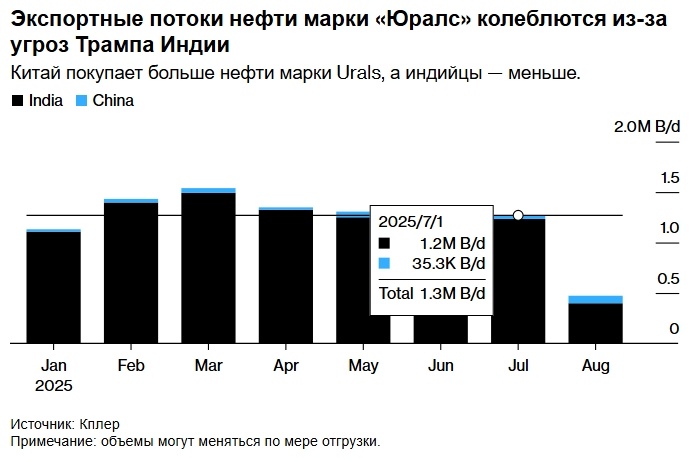 Нефтеперерабатывающие заводы Китая увеличили закупки российской нефти марки Urals, воспользовавшись скидками на партии, которые Индия больше не покупает из-за торговых пошлин США. По словам Цзянань Суня, аналитика Energy Aspects Ltd, китайские нефтеперерабатывающие заводы «на данный момент находятся в удобном положении, чтобы продолжать закупать российскую нефть», поскольку нефть марки Urals по-прежнему конкурентоспособна по сравнению с альтернативными сортами. Китайские нефтеперерабатывающие предприятия увеличили закупки основного сорта российской нефти, воспользовавшись возможностью приобрести её по льготной цене, от которой отказалась Индия из-за повышения торговых пошлин со стороны США. Хотя Китай является крупнейшим импортёром российской нефти, обычно он закупает её на Дальнем Востоке. Однако в августе поставки нефти марки Urals из портов Балтийского и Чёрного морей составили почти 75 000 баррелей в день. Это почти вдвое больше среднего показателя за год, который составляет около