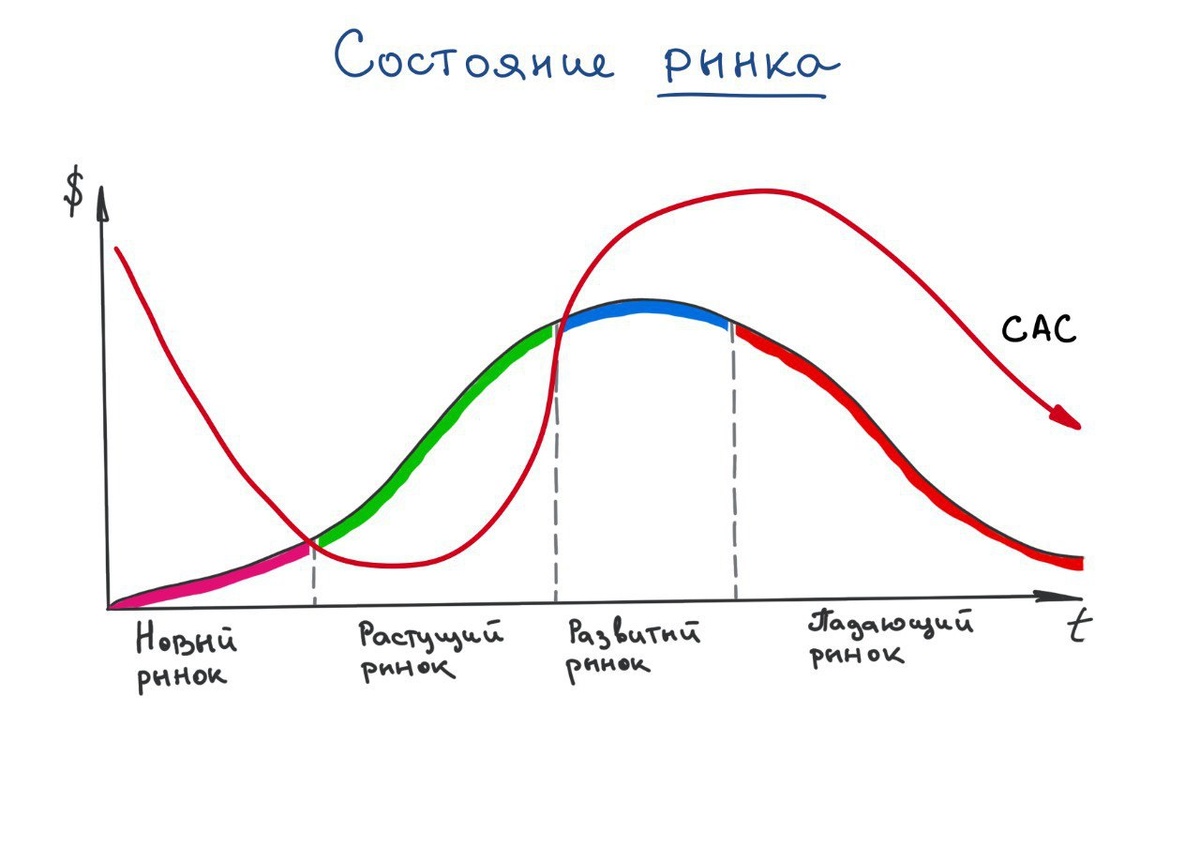 📌CAC (от англ. Customer Acquisition Cost) в маркетинге — метрика, показывающая стоимость привлечения одного нового клиента. Грубо — это все затраты на маркетинг плюс продажи, делённые на количество новых клиентов за этот период. На графике показаны 4 стадии рынка и наложенный на них график CAC. Что это означает на практике? 🔹 Новый рынок — ещё не сформировался устойчивый спрос на товар. Покупатели про него не знают или не считают его решением своей проблемы и выбирают другое решение. А другие продавцы ещё не верят в этот продукт и не развивают его. CAC — высокий. Маркетинг идёт туго. Вы тратите много денег, чтобы доказать покупателю, что это вообще ему нужно. Суеты много — продаж мало. А денег в кармане вообще нет. 🔹 Растущий рынок — покупателей на этот товар с каждым днём становится всё больше, а продавцов и предложения не хватает. Спрос превышает предложение. Это рынок продавца. CAC — низкий, но постепенно растёт. Маркетинг идёт резво и легко. Окупается всё, что вы запустите, даже