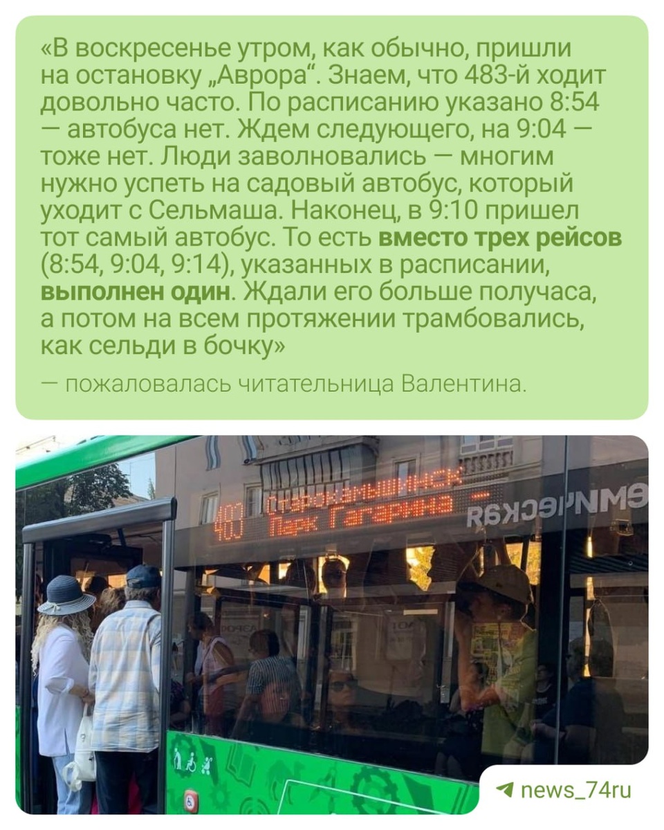 «Вместо трех рейсов — один!» Читатели пожаловались на сбой в работе популярного автобуса № 483. По их словам, в воскресенье утром вместо трех рейсов ходил только один. А это единственный транспорт, который соединяет Старокамышинск, Ленинский и центр после отмены маршрутки № 218. Самое неприятное — интервал между рейсами выпал именно на утро, когда транспорт нужен садоводам. Многим пришлось ехать на такси. Диспетчер на звонки пассажиров не ответил. Телефон на сайте Gortrans74.ru, который вечно рекомендуют чиновики, в выходные не работал. В будни выяснилось, что это номер бухгалтерии перевозчика — «Новые дороги». 🟥Почему воскресным утром не было рейсов. В диспетчерской маршрута № 483, контакты которого мы всё же отыскали, нам ответили, что у них нет фиксации времени по остановкам, только с Сельмаша. «По этому дню только двух машин не было, остальные все отработали четко. На линии были 13 из 15. Не знаю, какое расписание указано в „Гортрансе“, может, оно не соответствует. Мы работаем