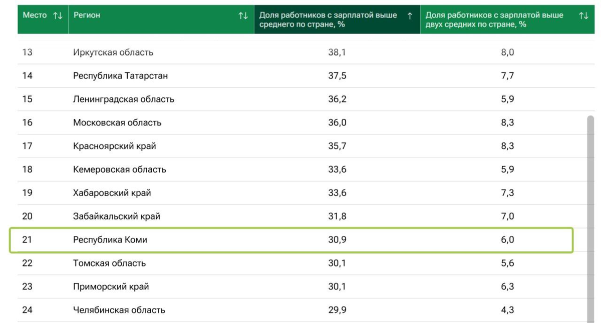 Республика Коми заняла 21 место в рейтинге регионов по доле работников с высокой зарплатой