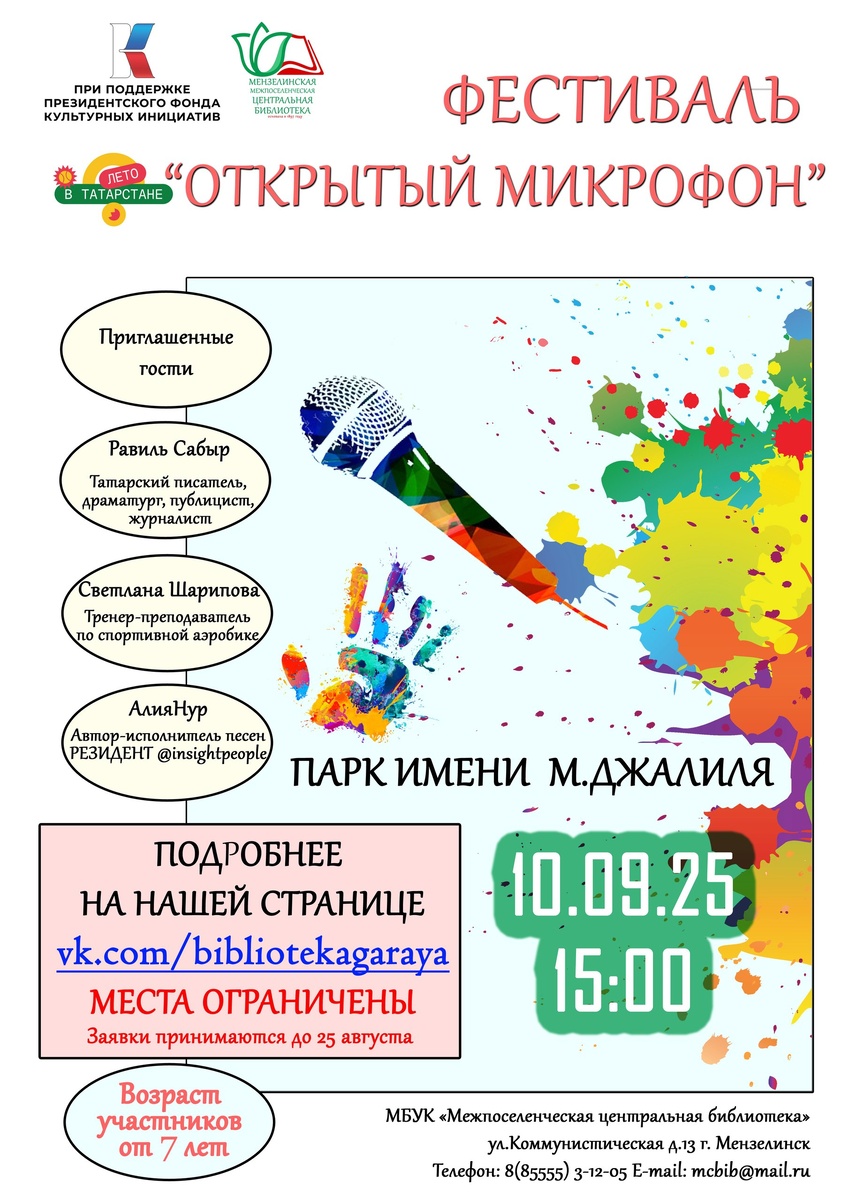 🎉 Приглашаем всех жителей и гостей города Мензелинска на фестиваль "Открытый микрофон"! 🎤✨ 🗓 10 сентября, в 15:00 часов, в парке имени Мусы Джалиля. Стань частью этого вдохновляющего события, выбрав свой жанр: 🗣 "Слово": Поделись своими мыслями, чувствами, идеями через поэзию или прозу. 💃 "Танец": Заворожи зрителей своими движениями и ритмом. 🎤 "Песня": Позволь своему голосу затронуть сердца слушателей. Наши гости: ✒ Равил Сабыр - татарский писатель, драматург, публицист, журналист. 🤸♀ Светлана Шарипова– тренер-преподаватель по спортивной аэробике; 🎤 АлияНур - Автор-исполнитель песен 🎶 РЕЗИДЕНТ @insightpeople. Погрузитесь в атмосферу веселья и творчества: 🎨🎭 вас ждут выставки, мастер-классы, игры и многое другое! Участвовать в Фестивале могут дети и подростки от 7 лет. ⚠ Заявки принимаются строго до 25 августа 2025 года включительно! Заявка для участия по ссылке cloud.mail.ru/public/pvC... Проект реализуется при поддержке Президентского фонда культурных инициатив.