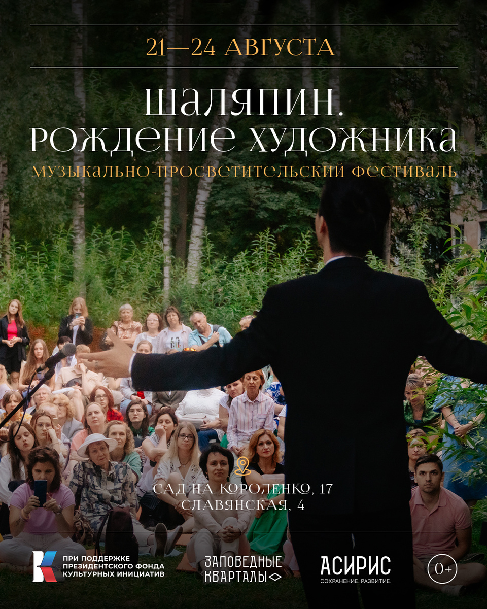 Уже на этой неделе, с 21 по 24 августа, откроется фестиваль «Шаляпин. Рождение художника», а квартал церкви Трёх Святителей превратится в большую сцену под открытым небом! Вас ждёт иммерсивный перформанс в окнах старинной усадьбы, камерные концерты с участием солиста Мариинского театра Дмитрия Григорьева и студентов консерватории, а также лекции искусствоведов о том, как провинциальный юноша без музыкального образования покорил мировые сцены. Для детей подготовили особую программу: мастер-классы по созданию «Книги следопыта» из отпечатков листьев и плодов, актёрские тренинги с режиссёром Львом Харламовым и эксперименты с красками в «Мастерской ошибок». Пройдут семинары театрального педагога Валерия «Чтение с остановками в жанре театральной педагогики» и художника Якова Хорева «Практики раскрытия творческого потенциала подростка». А вечером 24 августа фестиваль завершится выступлением хора «Нижний Новгород». Все события бесплатные, но требуют регистрации — успевайте забронировать место!