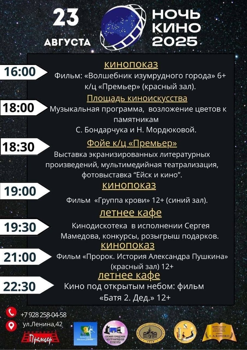 🎬 23 августа – Ночь кино в Ейске! Приглашаем вас отпраздновать вместе с нами! 📽 Программа: 16:00 – «Волшебник изумрудного города» 6+, к/ц «Премьер», красный зал (вход свободный). 18:00 – Площадь киноискусства: музыка, возложение цветов к памятникам С. Бондарчука и Н. Мордюковой. 18:30 – Фойе к/ц «Премьер»: выставка экранизированных книг, театрализация, фотовыставка «Ейск и кино». 19:00 – «Группа крови» 12+, к/ц «Премьер», синий зал (вход свободный). 19:30 – Летнее кафе к/ц «Премьер»: кинодискотека, музыка Сергея Мамедова, конкурсы и подарки. 21:00 – «Пророк. История Александра Пушкина» 12+, к/ц «Премьер», красный зал (вход свободный). 22:30 – Кино под открытым небом: «Батя 2. Дед.» 12+. #Ейск #НочьКино
