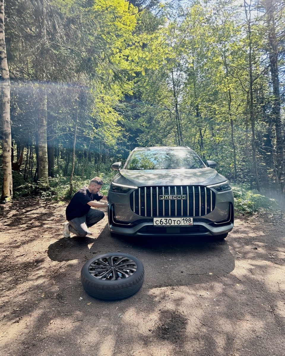 🛣 Дорога к себе с JAECOO: Путешествие Жени 🛣👦🏻 ГЛАВА 7 Женя аккуратно вел JAECOO по краю леса, наслаждаясь видом и душевным теплом после разговора с мамой. До асфальта оставалось всего метров пятьдесят. И вдруг – глухой удар снизу, резкое шипение! Машина накренилась. "Прокол!" – мелькнула догадка. Он остановился, вышел. Переднее правое колесо стремительно сдувалось. А рядом, торчащая из грунта, зловеще блестела ржавая арматура – кусок старой трубы, невидимый в высокой траве у края дороги. До заката оставалось часа три, а до заветной сосны – всего несколько сотен километров. Он должен был успеть! Теперь планы рушились. Первой мыслью было – звонить в службу поддержки. Но потом он вспомнил: у JAECOO J8 – полноразмерная запаска на оригинальном диске! Не "докатка", ограничивающая скорость, а настоящее колесо! "Справлюсь сам!" – решил Женя. Пока он возился, к месту остановки подъехали еще две машины – видимо, тоже любители природы или просто неравнодушные люди, предложили помощь. Вс