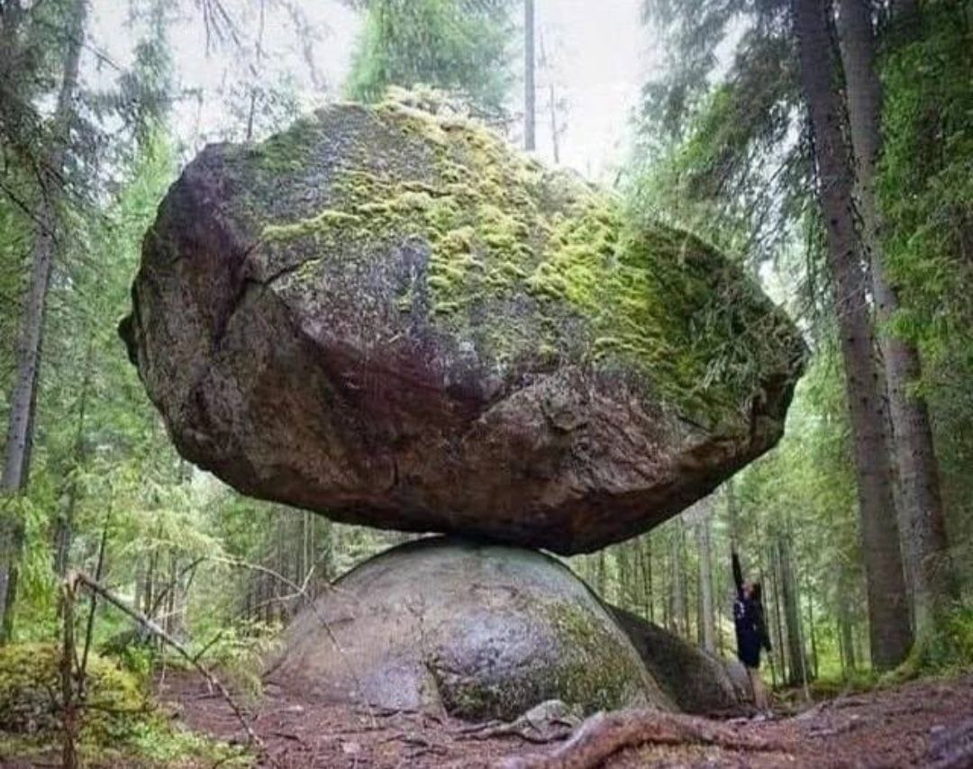 В лесах Финляндии находится вот такое природное чудо, известное как Куммакиви: массивный 500-тонный валун, стоящий на вершине другого камня. В этом положении он сохраняется несколько тысяч лет. Его часто называют «странной скалой». Кажется, что он должен упасть в любой момент, но он не падает. #камни