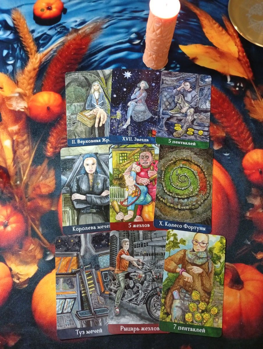Карты советуют пересмотреть своё поведение и тактику. Проанализировать ситуацию, почему она возникает снова и снова, почему вы ходите по кругу? Поменяйте своё отношение к ситуации. Ответьте на вопрос: а может быть это Я что-то делаю не так? Что я могу сделать , чтобы ситуация изменилась?