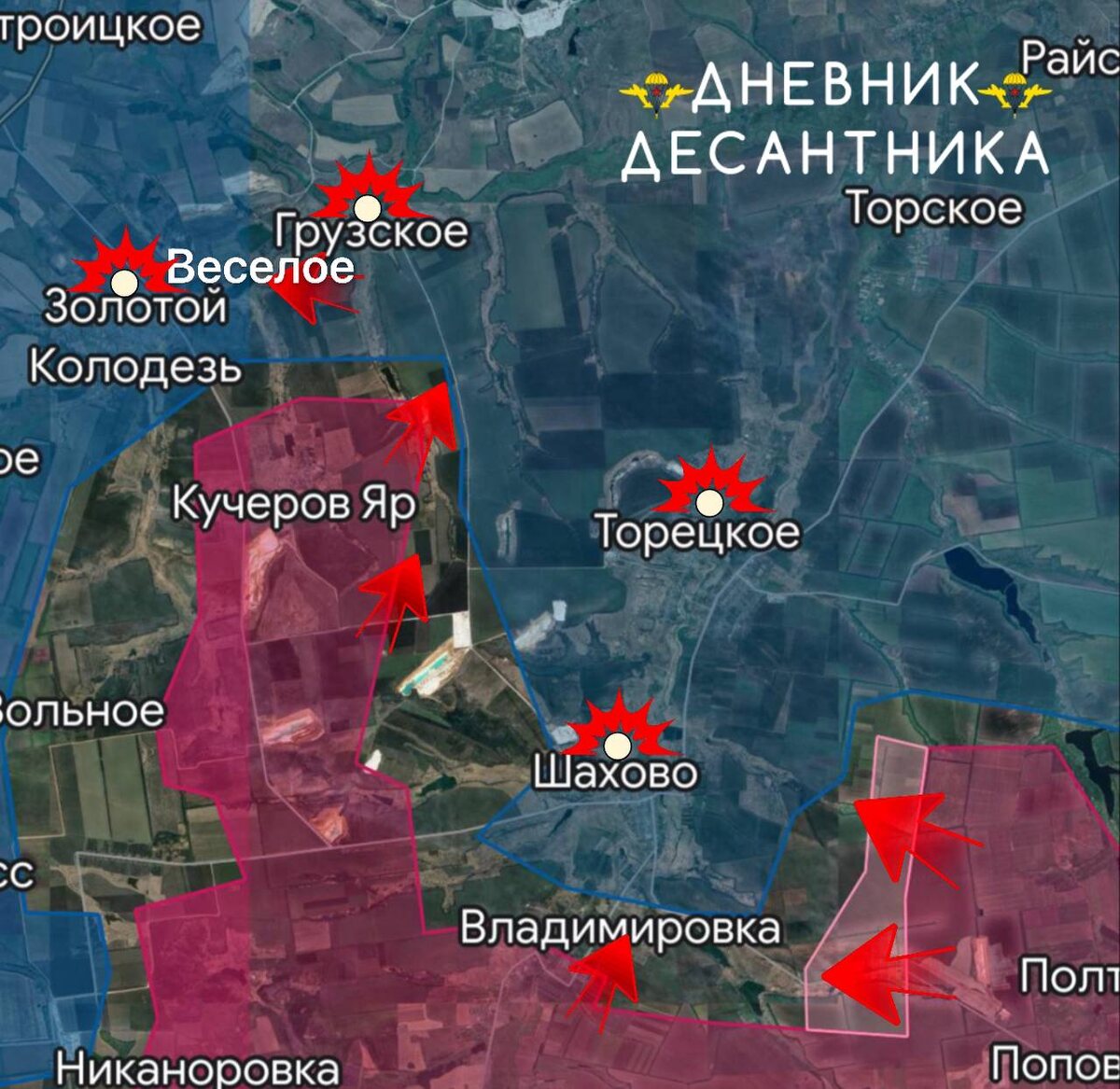 🪂 Добропольское направление. В Кучеров Яр наши штурмовые группы обошли населенный пункт с правового фланга и дошли с северо-востока к его окраинам. От Кучеров Яра до Веселого нашим войскам удалось взять под контроль балку Викнина, которая и соединяет два населённых пункта. В Веселом также замечены передвижения наших войск. В центральной части села бойцы ВС РФ закрепились в юго-восточной части. От Полтавки зачищаем карман и продвигаемся на запад к Шахово, также идёт наступление наших войск и южнее от Владимировки. ▫️ Дневник Десантника