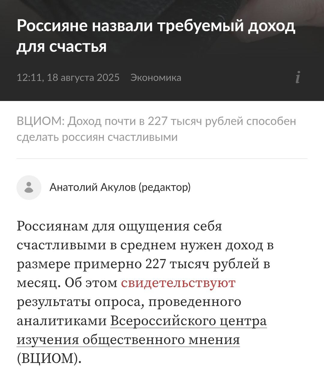 Опрос проводился 12 июля 2025 года. В нем приняли участие в общей сложности 1,6 тысячи совершеннолетних россиян из разных регионов. Предельная погрешность результатов, уточнили в организации, с вероятностью 95 процентов не превышает 2,5 процента. По итогам исследования выяснилось, что россиянам для счастья в среднем нужен ежемесячный доход в размере 226 921 рубля, сообщает Лента. Наибольшие требования в целом предъявляют жители крупнейших российских городов. Так, в Москве и Санкт-Петербурге показатель составил 694 353 рубля в месяц, а в среднем в миллионниках — 175 739 рублей. В небольших городах россиянам для счастья нужно в районе 194 тысяч. 😁 А сколько вам для счастья надо? 💡 Устали от пустых прогнозов? В моём Telegram-канале — рабочие разборы компаний, актуальные новости и инвест-мемы для разрядки. Заходите!