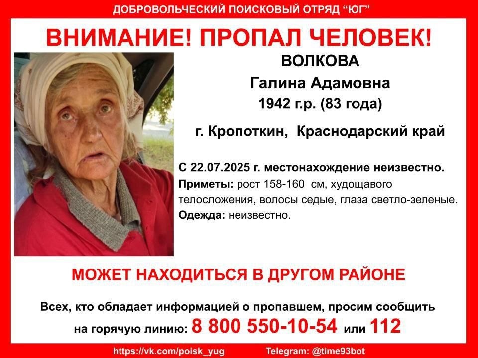 Внимание! Пропал человек! #Волкова Галина Адамовна, 1942 г.р., (83 года) г. #Кропоткин, #Кавказский р-н, Краснодарский край. С 22.07.2025 г. местонахождение неизвестно. Инфорг поиска: Юлия 89528724228 Всех, кто обладает информацией о пропавшем, просим сообщить по телефону бесплатной горячей линии 88005501054 или 112. Если вы готовы помогать в поиске пропавших без вести, приглашаем присоединиться к телеграм-чату оповещения: t.me/poisk_193
