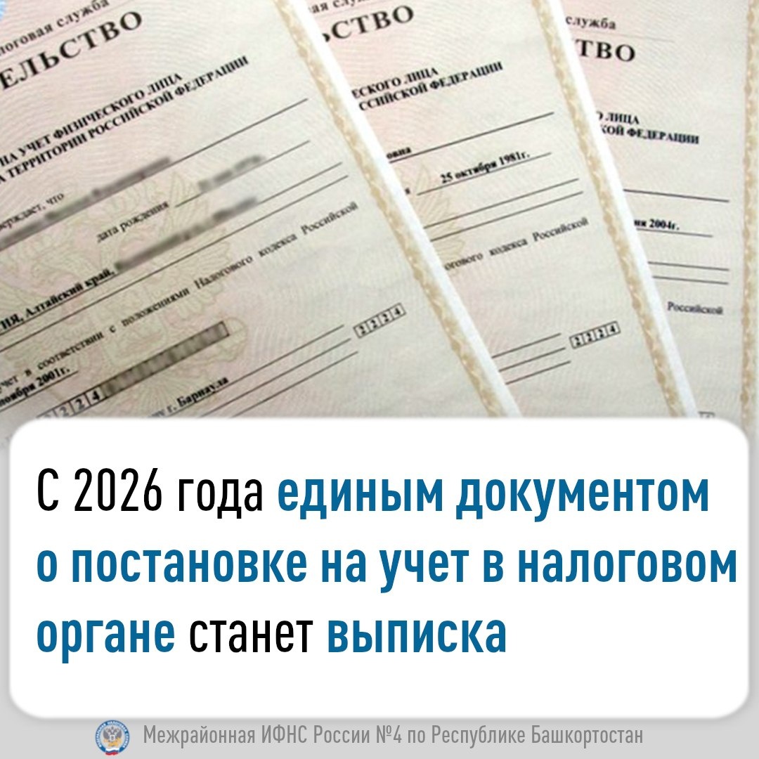 С 1 января 2026 года свидетельство о постановке на учет в налоговом органе упраздняется. Для физических лиц подтверждать постановку на учет будет выписка из ЕГРН (Единого государственного реестра налогоплательщиков). Но выданные ранее свидетельства менять не придется, они сохраняют свою силу.