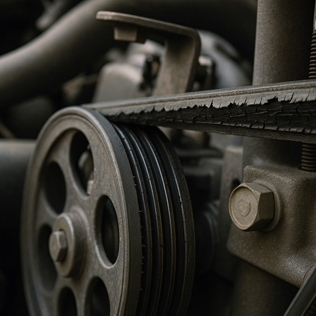 - Проблемы со шкивами — несоосность, выработка, неправильная установка или бракованные детали приводят к неправильному контакту ремня.