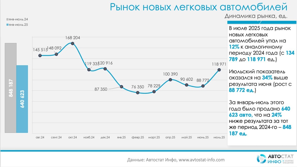 Китайский сегмент замедляется: спад в июле и минус четверть за семь месяцев Российский рынок новых китайских автомобилей в июле и по итогам семи месяцев 2025 года впервые за несколько лет показывает устойчивое снижение. По данным «Автостат Инфо», с января по июль было продано 326 077 машин — на 27% меньше, чем год назад (447 904 шт.). В июле падение составило 21%: 65 593 автомобиля против 82 629 в прошлом году.. Несмотря на то что китайские марки продолжают доминировать на рынке, динамика свидетельствует о постепенном охлаждении спроса. Больше всего снижение сказалось на традиционных лидерах сегмента. Haval за январь–июль реализовал 77,2 тыс. автомобилей против почти 99 тыс. годом ранее, Chery — 68,9 тыс. против 86,4 тыс., Geely — 44 тыс. против 83 тыс., а Changan — 36,8 тыс. против 59,3 тыс. Даже в июле, когда сезонный спрос традиционно оживает, эти бренды показали двузначное падение: Haval потерял 22% продаж, Chery — 6%, Geely — 37%, Changan — 31%. При этом в премиальном сегменте д