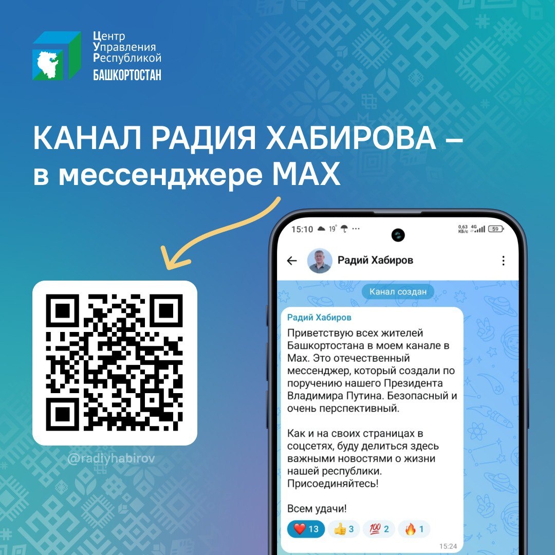 Радий Хабиров создал канал в мессенджере MAX. Это отечественный мессенджер, который запустили по поручению Президента России. В канале будут публиковаться важные новости о жизни Башкортостана. Подписаться можно по ссылке: https://max.ru/radiyhabirov