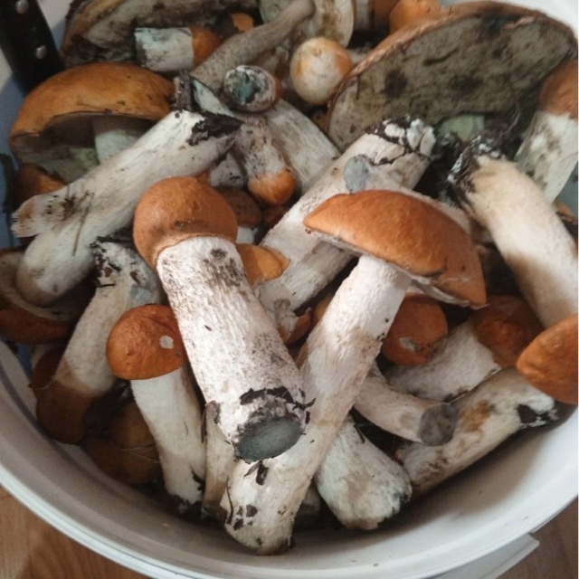 На изображении представлены грибы, которые с высокой долей вероятности являются Красноголовиками или, как их еще называют, Подосиновиками. Это видно по характерной яркой оранжево-красной шляпке и толстой, белой ножке с темными чешуйками, которые являются отличительной чертой подосиновиков. Также на фото видно синеющее потемнение на срезах, что характерно для некоторых видов подосиновиков при контакте с воздухом или при повреждении.