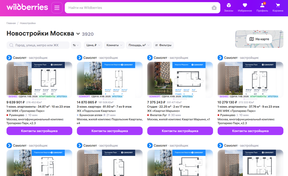 Основательница компании и глава объединенной группы Wildberries и Russ Татьяна Ким рассказала в Telegram, что сейчас на тестовой стадии находится проект продажи квартир через маркетплейс. Теперь на платформе Wildberries можно не только покупать одежду или технику, но и изучать квартиры в новостройках. Положить в корзину жилую площадь невозможно. Пока в тестовом разделе представлены квартиры группы «Самолет». Для связи используется временный телефон, доступный только для звонков — смс и сообщения через мессенджеры не принимаются. Сейчас на платформе доступно 3920 квартир в Москве. Однако пока, как убедился корреспондент редакции «Деловой квартал - Санкт-Петербург», купить квартиру в привычном формате нельзя. Посредством площадки можно лишь позвонить застройщику. В новом разделе можно найти карточки квартир с полной информацией: адрес, срок сдачи, количество комнат, площадь, цена и другие детали. Для связи с застройщиком есть прямой телефон. Скриншот с сайта Wildberries В 2024 году «Само
