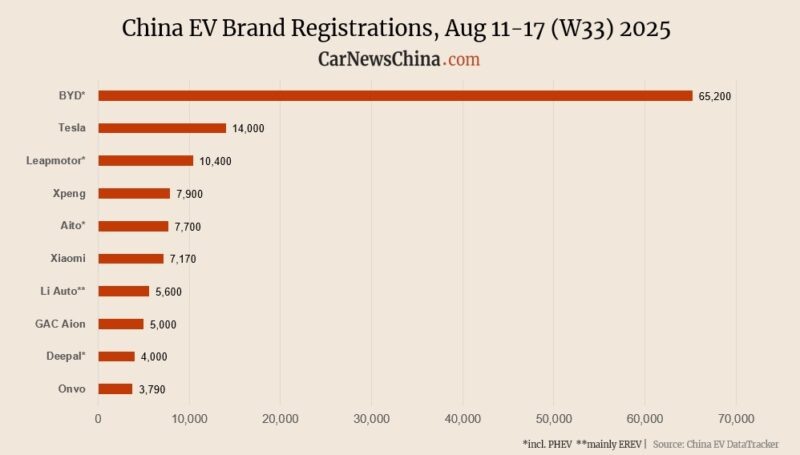 Вторая неделя августа 2025 года принесла заметный рост регистраций электромобилей в Китае. Tesla, Nio, Xpeng, BYD и другие бренды показали динамику, которая может повлиять на весь рынок. Подробности — в нашем материале. Вторая полная неделя августа 2025 года стала знаковой для китайского рынка электромобилей. Несмотря на ограничения по публикации еженедельных данных, интерес к статистике регистраций не ослабевает — ведь именно эти цифры позволяют понять, как меняется спрос на электрокары в Поднебесной. Лидером недели вновь стал BYD, зарегистрировавший 65 200 новых электромобилей и гибридов — это на 19% больше, чем неделей ранее, но на 16,9% меньше, чем в аналогичный период прошлого года. За первые две недели августа BYD уже поставил на учет 120 000 машин, что подтверждает его статус крупнейшего игрока на рынке. Tesla также показала уверенный рост: 14 000 регистраций за неделю, что на 4,5% больше, чем в предыдущий отчетный период. Однако по сравнению с прошлым годом результат чуть снизи