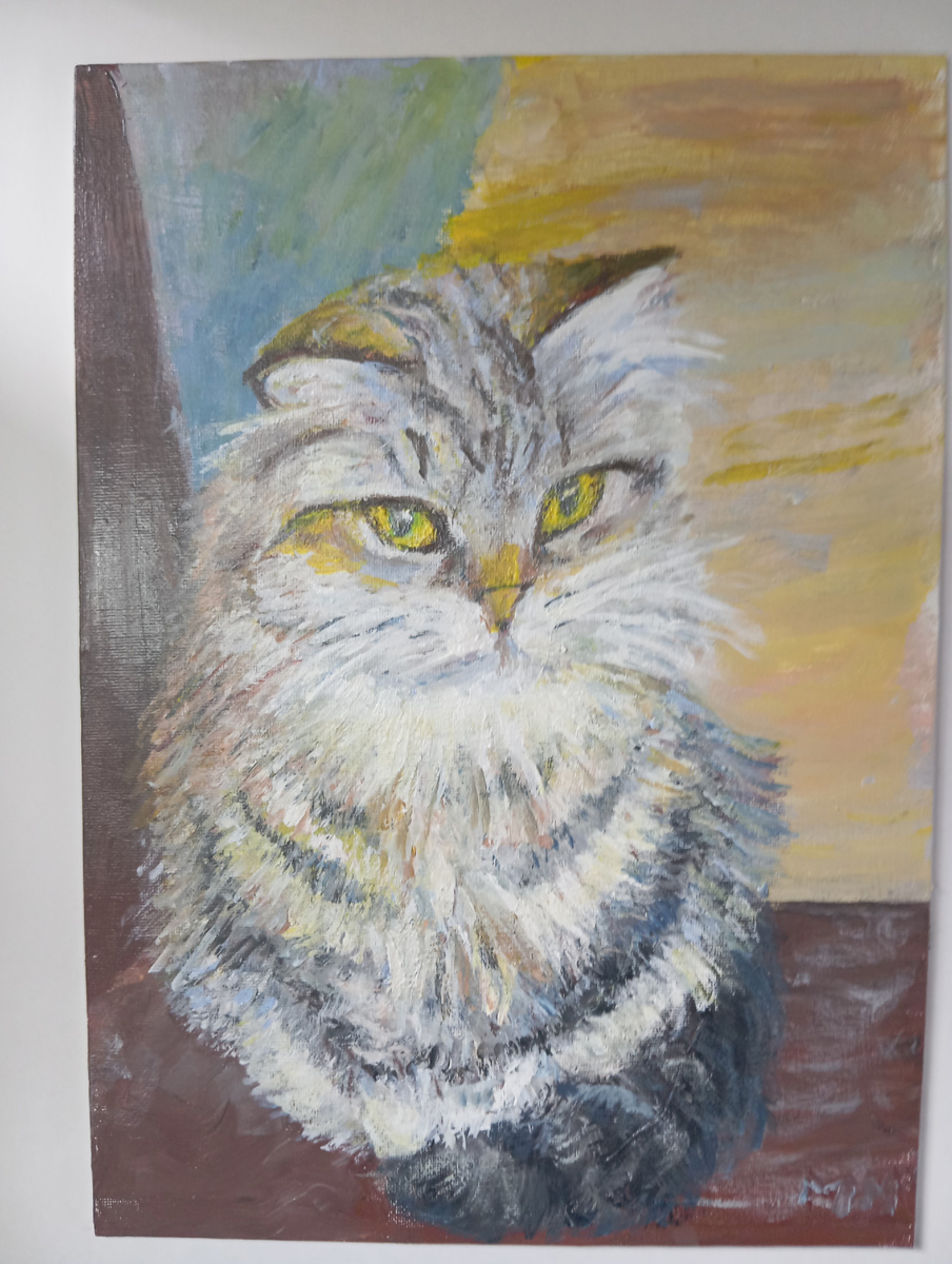 Когда договаривалась с подругой о кошачьей фото сессии, мне рассказали, что Ася - кошка, живущая на одной территории с двумя котами, тихая и скромная, из своего угла редко выходит. Она и в самом деле последняя вышла ко мне. Очень красивого окраса, с черным хвостом, в полоску пушистый комок, есть подозрение, что в ее предках были шотландские вислоухие кошки, только вот проживание в Сибири способствовали необычной пушистости. Да что я вам здесь описываю, сами смотрите. Три дня ее писала акрилом. Холст на картоне 25х35.