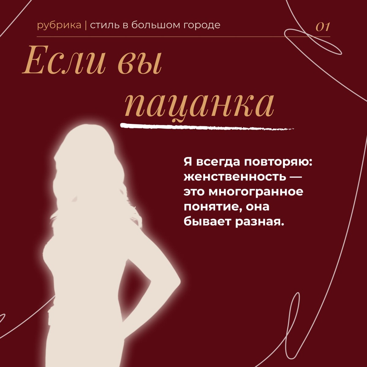С базовым и деловым женским гардеробом мы разобрались. А как же подчеркнуть «пацанский» характер тип внешности с помощью одежды, если вы этого хотите? Я всегда повторяю: женственность — это многогранное понятие, она бывает разная. Нет одинаковых женщин, каждая индивидуальна. И, чтобы быть счастливой, получать эстетическое удовольствие, смотря на себя в зеркало каждый день, и красиво нести себя в этот мир, нужно подчеркнуть СВОЮ индивидуальность. Вообще возможно ли это — быть женщиной по сути и определению, но подчеркивать свой твердый хартер, спортивный тип? Конечно да. Если вы чувствуете в себе силу, спортивность, дерзость, то не нужно надевать на себя нечто с цветочным принтом или обилием воланов и рюш, вставать на шпильки. В одежде вы в любом случае должны чувствовать себя комфортно. Динамика, спортивность, резкость в структуре внешности может быть присуща вам от природы — по типу фигуры, телосложению. Плюс ваш психотип, характер, подача, голос, жесты. Но запомните: человек меняе