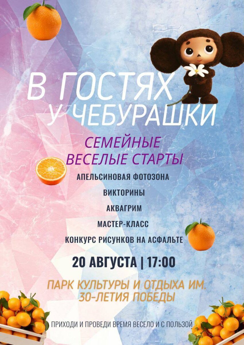 20 августа в 17:00 в Парке культуры и отдыха им. 30-летия Победы пройдёт яркий семейный праздник «В гостях у Чебурашки»! Вас ждут: 🎉 Весёлые старты и конкурсы 🍊 Апельсиновая фотозона 🎨 Аквагрим и мастер-классы ✏️ Рисунки на асфальте 📚 Увлекательные викторины Приходите всей семьёй – будет весело и незабываемо! 🧡