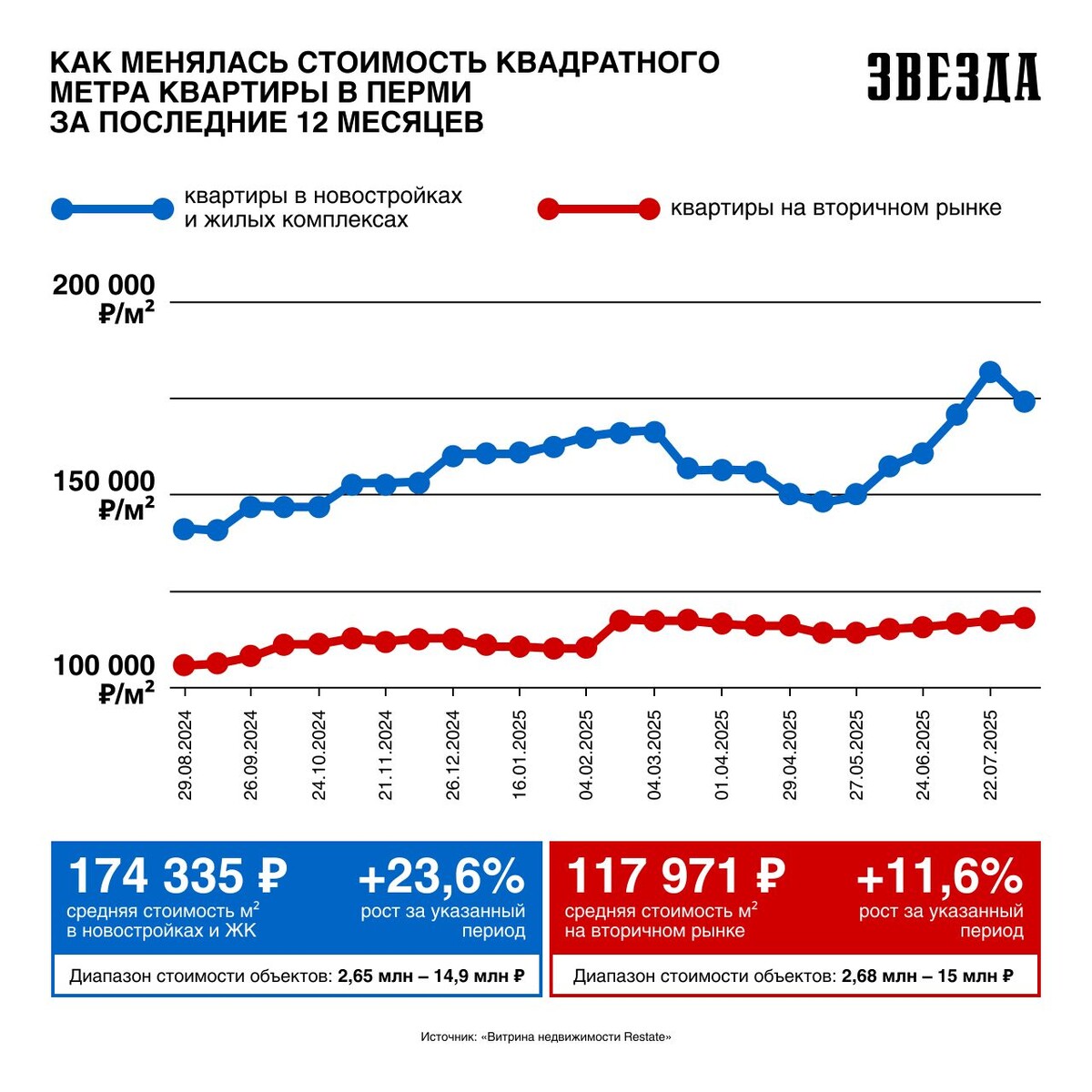Средняя стоимость квадратного метра в пермской новостройке составляет 174 335 рублей, что на 33 292 рубля (около 24%) больше, чем год назад. Такими данными с журналистами газеты «Звезда» поделились аналитики «Витрины недвижимости Restate». Рост цен в Перми наблюдается не только на квартиры в новостройках, но и на всю недвижимость в целом. Это связано с устойчивым спросом на современные жилые комплексы, действующей государственной поддержкой ипотечных программ и ограниченным количеством доступного жилья комфорт-класса. Стоимость квартир в новостройках варьируется от 2,65 до 14,9 миллиона рублей. Цена на квадратный метр отражает не только ценность новых проектов, но и ограниченность предложения. На вторичном рынке средняя стоимость «квадрата» равна 117 971 рублю, с приростом за год на 12 288 рублей (примерно 11,6%). Рост здесь более умеренный, что объясняется стабильным предложением и меньшей зависимостью от себестоимости строительства и льготной ипотеки. Диапазон цен на вторичное жилье