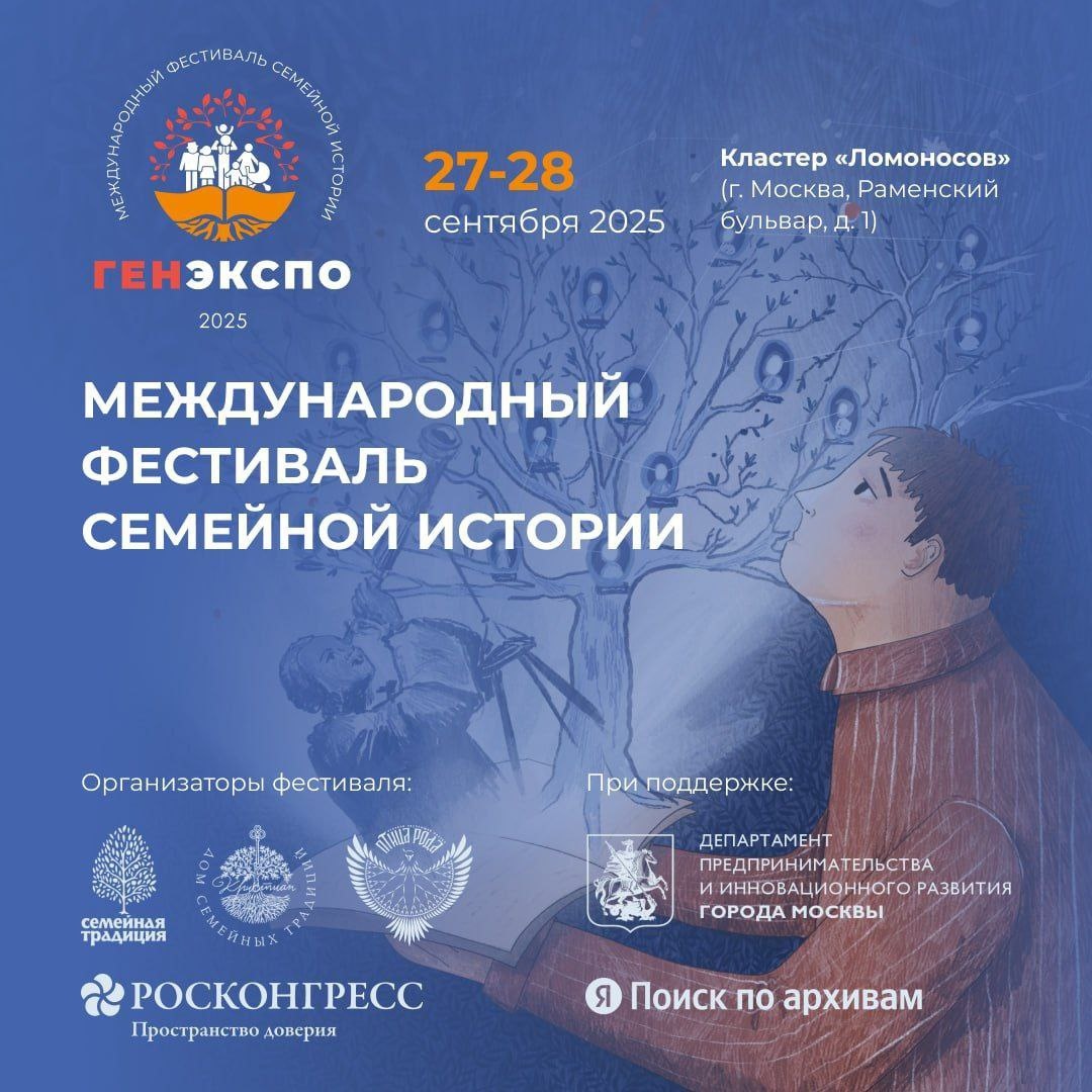 Друзья, у нас две замечательные новости! 👉 Открыта регистрация на II Международный фестиваль семейной истории «ГенЭкспо-2025». Грандиозное событие пройдёт 27-28 сентября 2025 в кластере «Ломоносов» (г. Москва, Раменский бульвар д.1). На фестивале вы узнаете о разных аспектах исследования собственного рода; познакомитесь с ведущими российскими специалистами в области генеалогии и семейной истории; обменяетесь знаниями с единомышленниками, исследователями и хранителями семейной памяти. · Актуальное расписание и организационные моменты появятся в конце августа в боте и на сайте фестиваля. · Анонсы выступлений, информация о лекторах и ведущих — в социальных сетях ГенЭкспо, а также в разделе «Программа» на сайте. А как это было в прошлом году, можете увидеть здесь. 👉 В рамках фестиваля мы проведем Форум преемственности «Наследие. Традиции и инновации» о бизнесе и культуре передачи капитала. Это закрытая VIP-программа и единственное событие в России, где владельцы капитала, преемники и пре