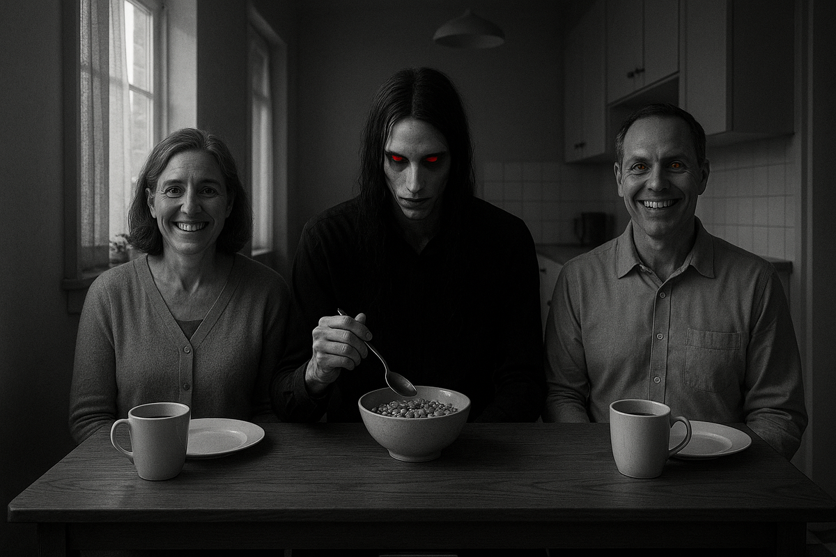 Ему было, может быть, лет тридцать с небольшим. Длинные, прямые чёрные волосы спадали ему на плечи, резко контрастируя с бледной кожей. Но глаза… глаза были первым, на что невозможно было не обратить внимания. Они были шокирующе яркие, желтушно-жёлтые. Цвет канарейки или свежего синяка. И они были уставлены на миску с хлопьями перед ним с тревожной сосредоточенностью.