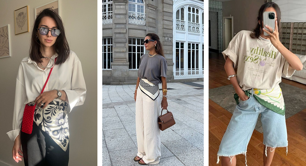 Кожаный ремень — незаменимый элемент в гардеробе, который помогает подчеркнуть талию и завершить образ. Но иногда хочется уйти от привычного и добавить луку больше оригинальности и характера. Ниже — примеры аксессуаров, которые помогут сделать это. Классические платки размером 90 х 90 см в этом году стали исчезать с прилавков магазинов быстрее, чем что-либо. Уже несколько месяцев инфлюенсеры по всему миру активно заменяют аксессуаром привычные ремни. И это неудивительно — образы с шелковыми платками на талии получаются изысканными и яркими одновременно. Если большая часть гардероба составлена в классическом стиле, советуем обратить внимание на однотонные и с ненавязчивым принтом платки. Тем, кто хочет выделиться из толпы или сделать более ярким монохромный лук, больше подойдут платки с цветочным, фруктовым или абстрактным принтом. Носить их можно как в первой половине дня, так и вечером. Аксессуар, отсылающий к эстетике прошлых столетий, уже много раз возвращался на полки модных магази