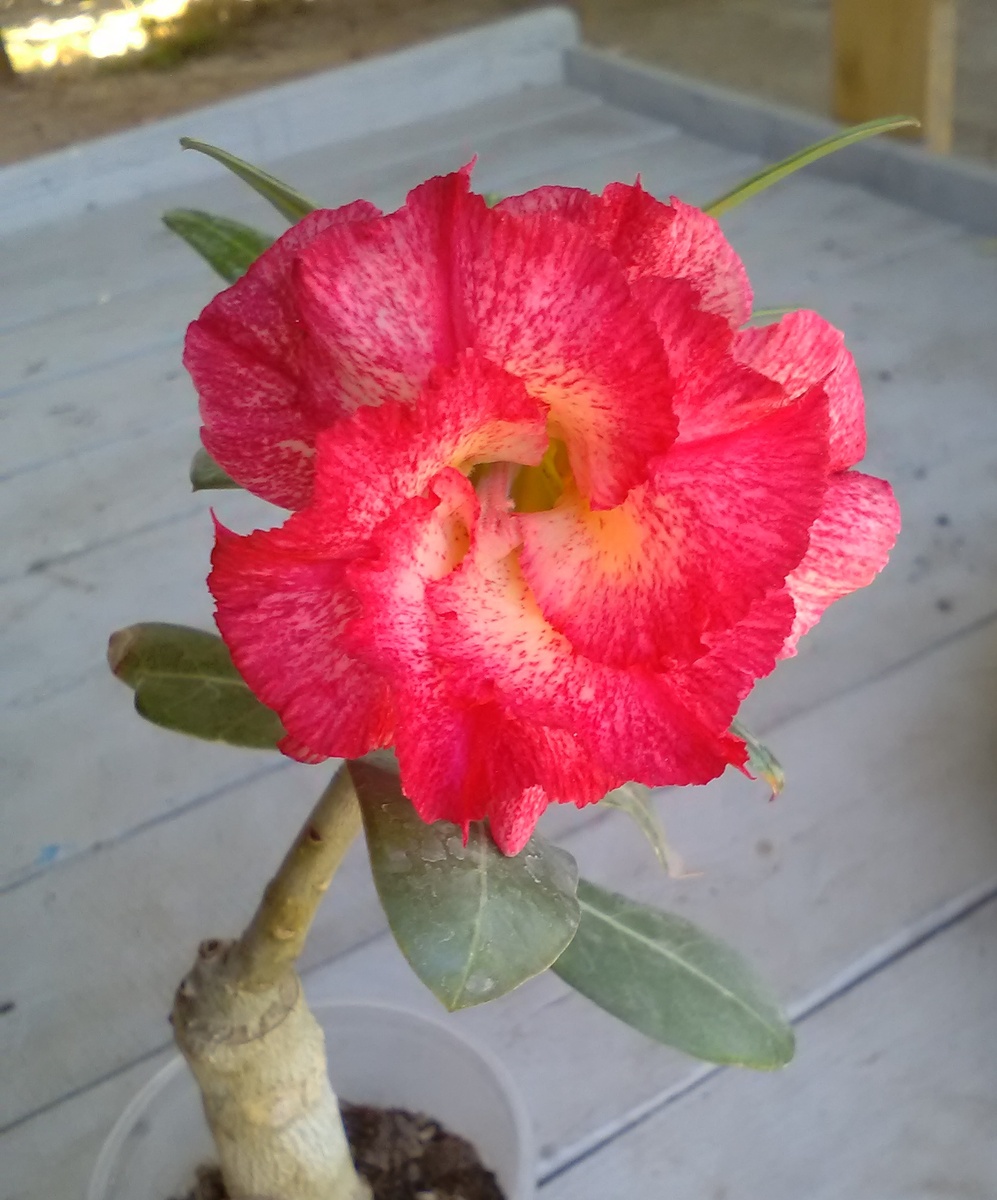 Опять зацвел Mists, и так красиво, как в этот раз, он не цвел никогда. Какая прелесть этот сорт! Первый раз цвел маленькой привовочкой прошлой осенью, на стеллаже, когда никто из адениумов не цвел. Второй раз этой весной, и опять же единственный из всех. И вот решил ещё порадовать, на прощанье с летом. Невероятный цветун! Фигурка у него, правда, не очень. Привит на черенок, к тому же почка на прививке проснулась только одна, соответственно и побег один, да ещё и вбок смотрит. Хоть черенок-подвой и толстый, но смотрится довольно неказисто. Зато цветок - ну это просто чудо какое-то! Весь в крапинках, и желтая серединка постепенно переходит с сочный красно-малиновый. Ещё у него удивительно приятный аромат, совершенно непередаваемый. Хотелось бы мне иметь такой парфюм. И подумать только, я ещё не хотела его покупать! Взяла в основном из-за маленькой цены, как раз потому, что не на каудекс привит, а на черенок. Вот уж правду говорят: не знаешь, где найдешь, где потеряешь. Надо будет обяза